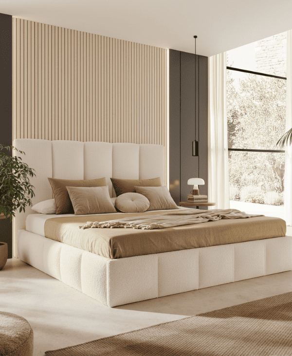 Cabecero 200 cm: pensado para camas Super King (200 × 200 cm); se convierte en la pieza protagonista del dormitorio gracias a su diseño tapizado con paneles verticales y su acabado sofisticado.