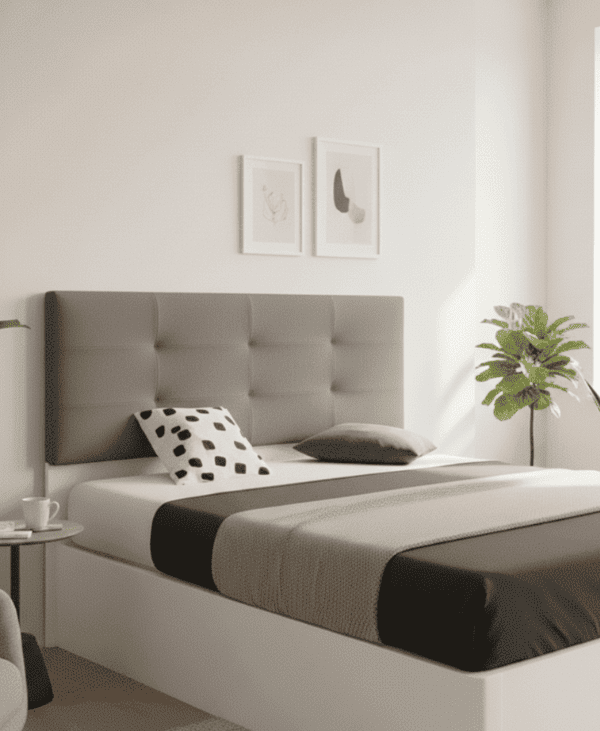 • Cabecero 90 cm: ideal para camas individuales o dormitorios juveniles. Su proporción ligera y su tapizado en tonos neutros aportan orden y amplitud visual.