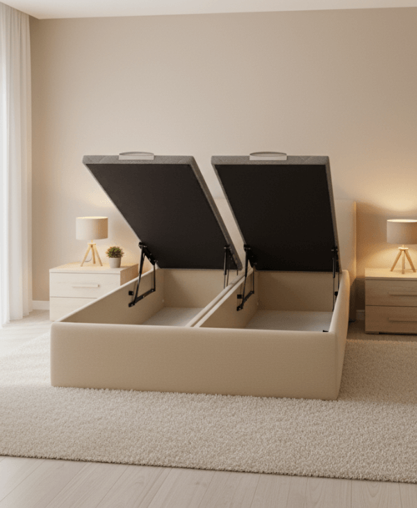 | Twin | Dos arcones independientes con frontal único | Apertura frontal asistida con pistones independientes Motorización eléctrica opcional | Tapa tapizada 3D antideslizante y transpirable | Parejas o dormitorios compartidos que buscan independencia y estilo |