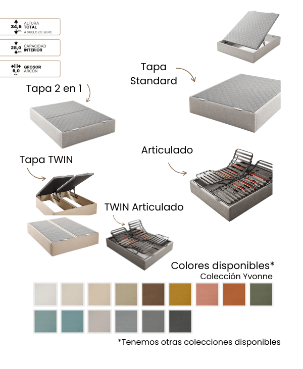 Opciones: Somier tapizado 3D activo, patas metálicas de 2,5 cm, zócalo decorativo, guardapolvo, kit de ruedas, cubrebisagras y apertura motorizada del arcón.