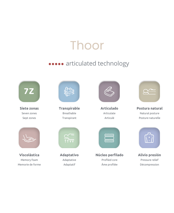 El colchón Thoor destaca por su núcleo de espuma viscoelástica de soja natural 40 kg/m³, que combina firmeza y adaptabilidad con una estructura de 7 zonas anatómicas para aliviar la presión y favorecer la postura correcta. Además, es transpirable, sostenible e hipoalergénico.
