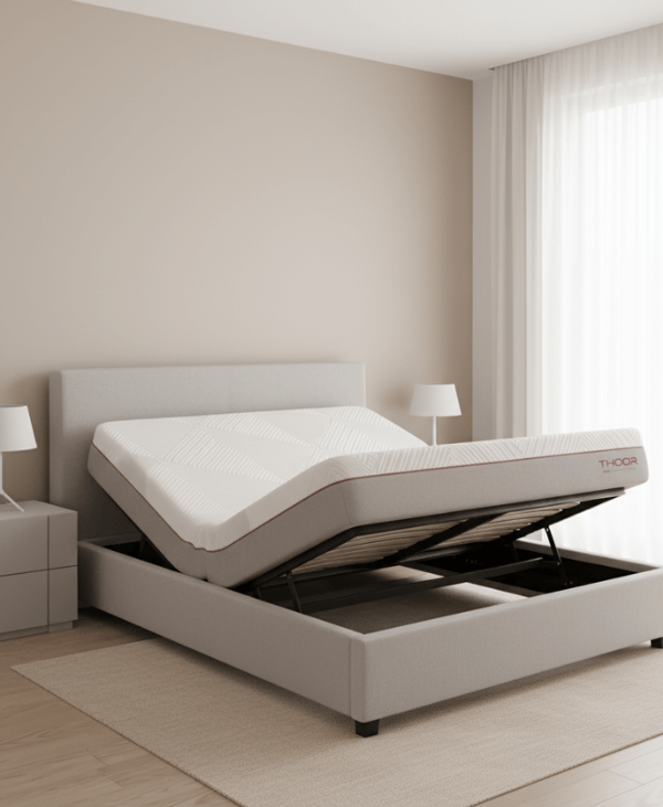El colchón Thoor es compatible con todo tipo de bases fijas o articuladas, incluyendo canapés abatibles, somieres de láminas y bases tapizadas. También está disponible en formato gemelo articulado.