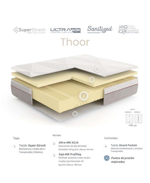 El colchón Thoor ofrece un descanso ergonómico, saludable y de alto rendimiento gracias a su núcleo viscoelástico Soja 40 kg y su perfilado anatómico de 7 zonas de confort, que se adapta punto por punto a la forma del cuerpo, aliviando la presión en hombros, caderas y zona lumbar.