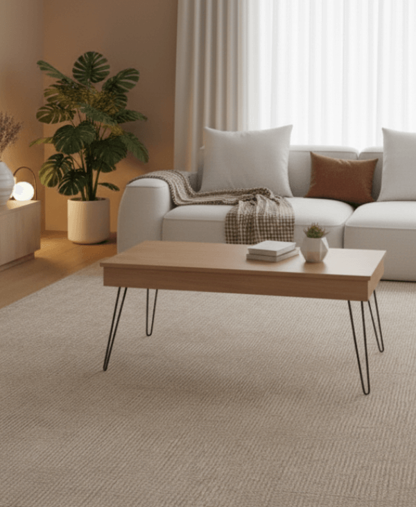 La mesa de centro Bahía destaca por su tapa elevable y su combinación de roble natural y patas metálicas.