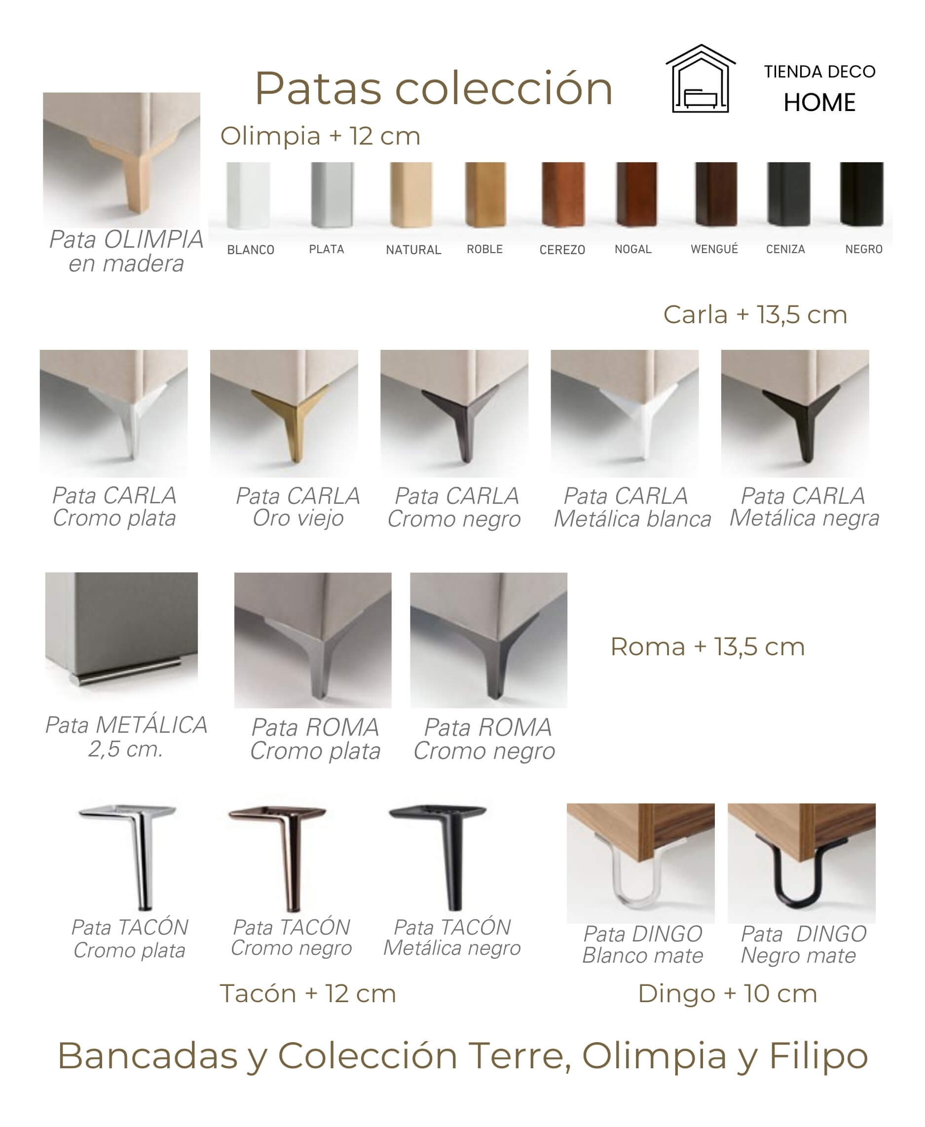 Carla Blanca, Carla Cromo Negro, Carla Cromo Plata, Carla Oro Viejo, Dingo Blanco Mate, Dingo Negro Mate, Olimpia Blanca, Olimpia Ceniza, Olimpia Cerezo, Olimpia Natural, Olimpia Negro, Olimpia Nogal, Olimpia Plata, Olimpia Roble, Olimpia Wengué, Pata metálica 2,5 cm, Roma Cromo Negro, Roma Cromo Plata, SIN PATAS, Tacón Cromo Negro, Tacón Cromo Plata, Tacón Negro