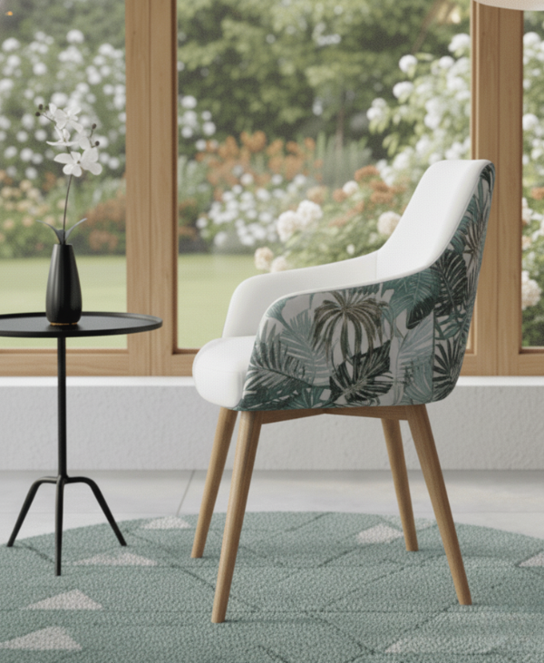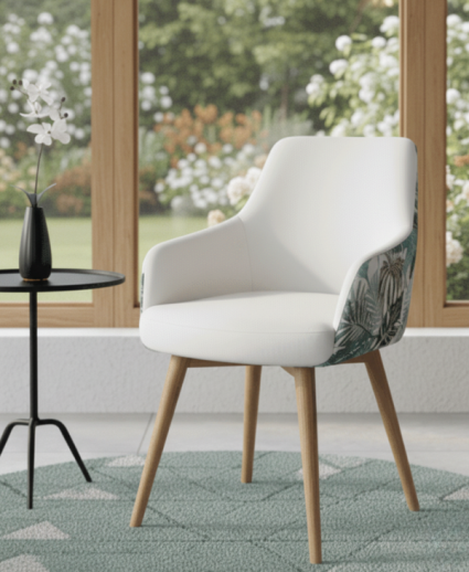 La silla de comedor Castellana destaca por su diseño tapizado integral y su estructura de madera, ofreciendo una estética envolvente y cálida.