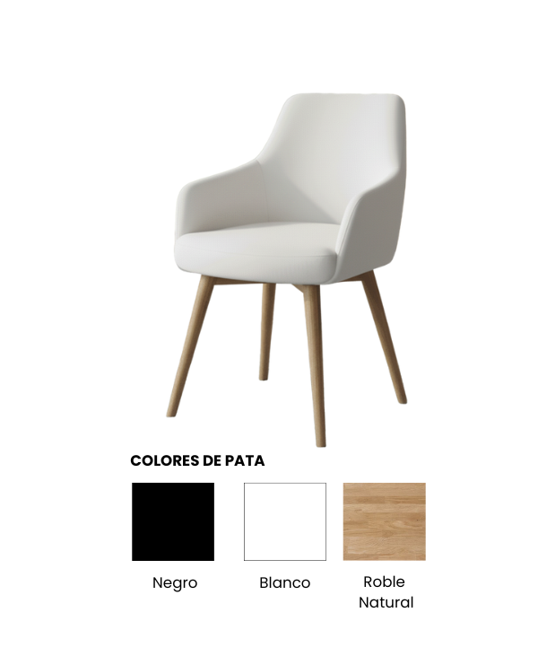 Sus patas macizas en acabado roble natural aportan firmeza visual y estabilidad, mientras que el respaldo ligeramente curvado garantiza una postura cómoda y ergonómica.