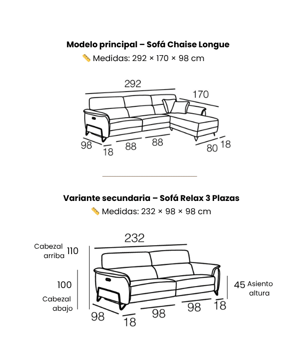 Medidas: 292×170×98 cm (modelo principal) / 232×98×98 cm (variante secundaria).
