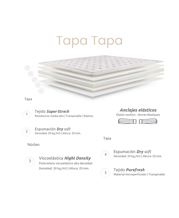 El Topper Tapa Tapa combina viscoelástica High Density con espumación Dry Soft para ofrecer una superficie más suave, adaptable y transpirable. Su tejido Super-Stretch y su base Purefresh mejoran la ventilación y prolongan la vida útil del colchón.